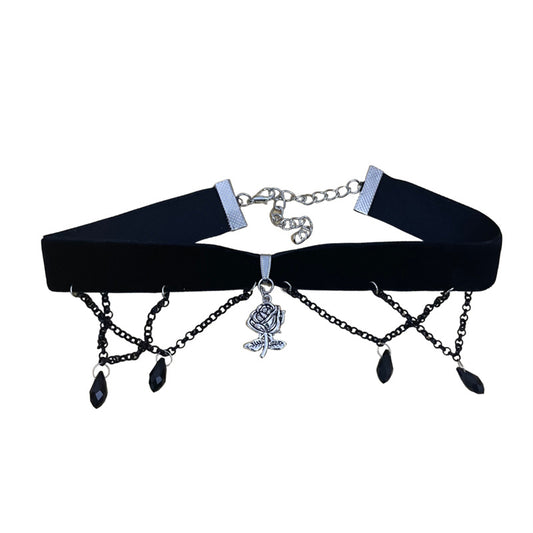Dark Gothic Camellia Pendant Black Tassel Flannel Halloween Necklace